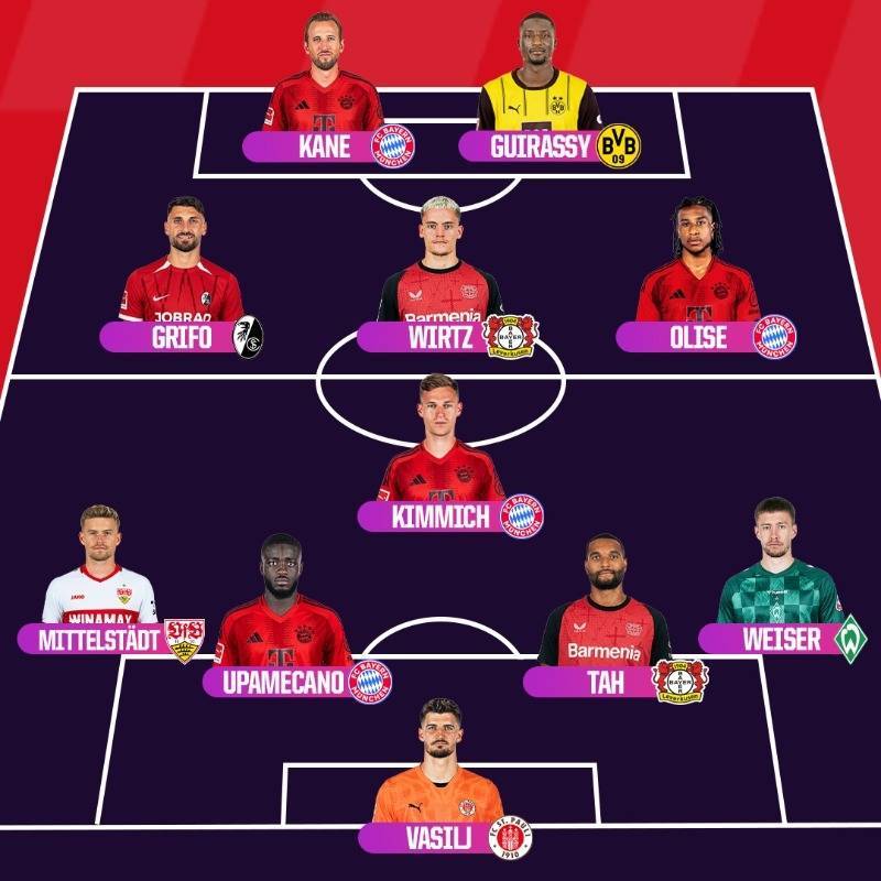 中场:基米希(拜仁)、维尔茨(勒沃库森)、奥利塞(拜仁)、格里福(弗赖堡)