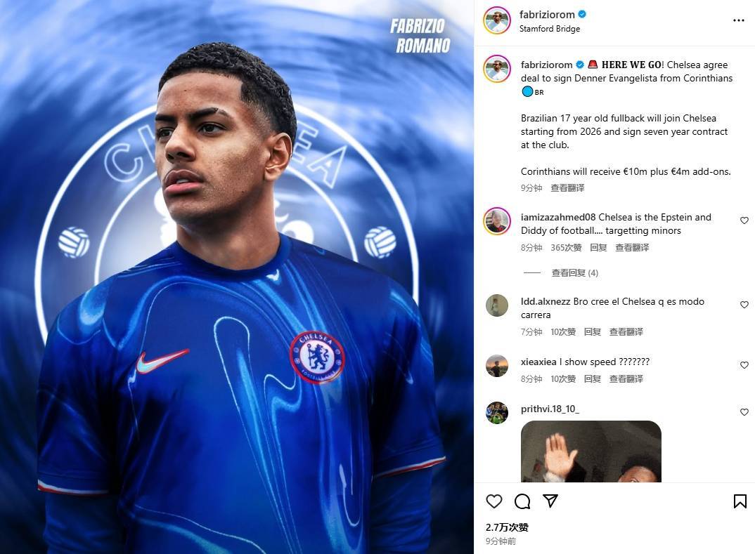 17岁的科林蒂安小将登纳2008年2月25日出生,他还没有为一线队效力过。罗马诺表示,登纳将在年满18岁后也即是2026年才加盟切尔西,签约时长为7年。科林蒂安方面将收到总价1400万欧的转会费(1000万固定+400万附加)。