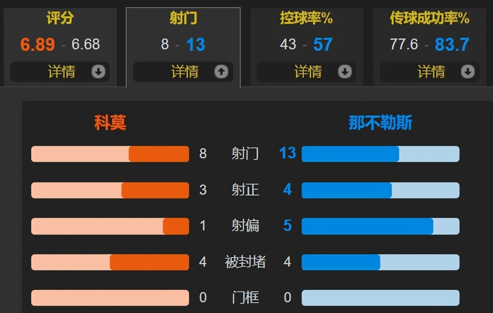 从全场数据来看,那不勒斯虽然控球率占优(57%),但射门次数和射正次数并未体现出明显优势。科莫则凭借高效的反击和把握机会的能力,成功拿下比赛。这也反映出现在意甲强队的比赛节奏和竞争难度,或许能解释他们在欧战中竞争力不足的原因。